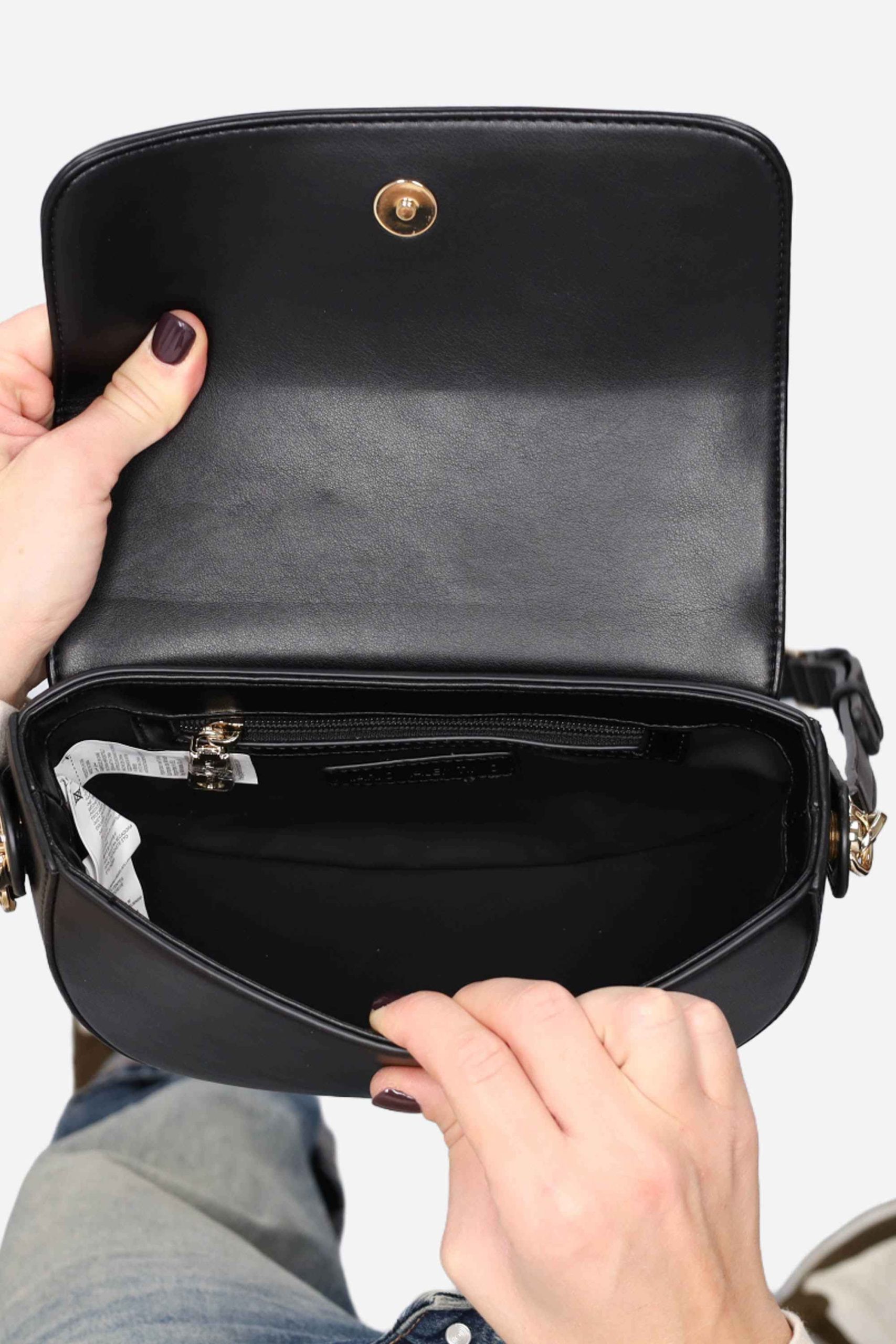 Presenta chiusura a patta con bottone a pressione, manico superiore rimovibile, due tracolla: una regolabile e una a catena, entrambi rimovibili.