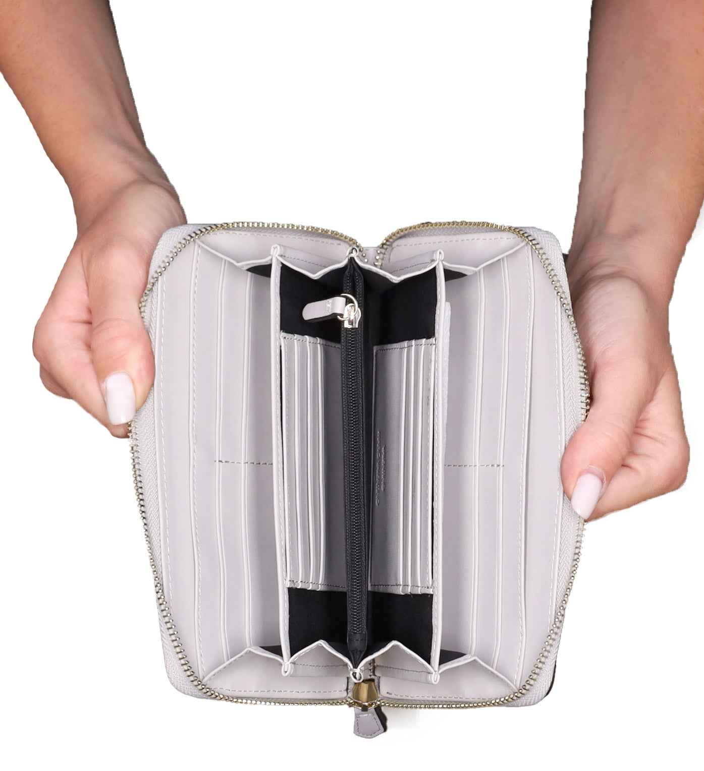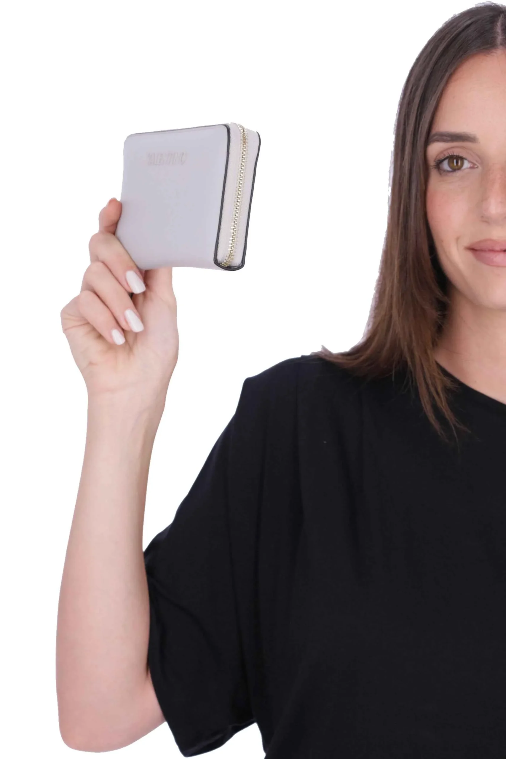 Il portafoglio è realizzato in poliuretano, con logo sul davanti e chiusura con zip.