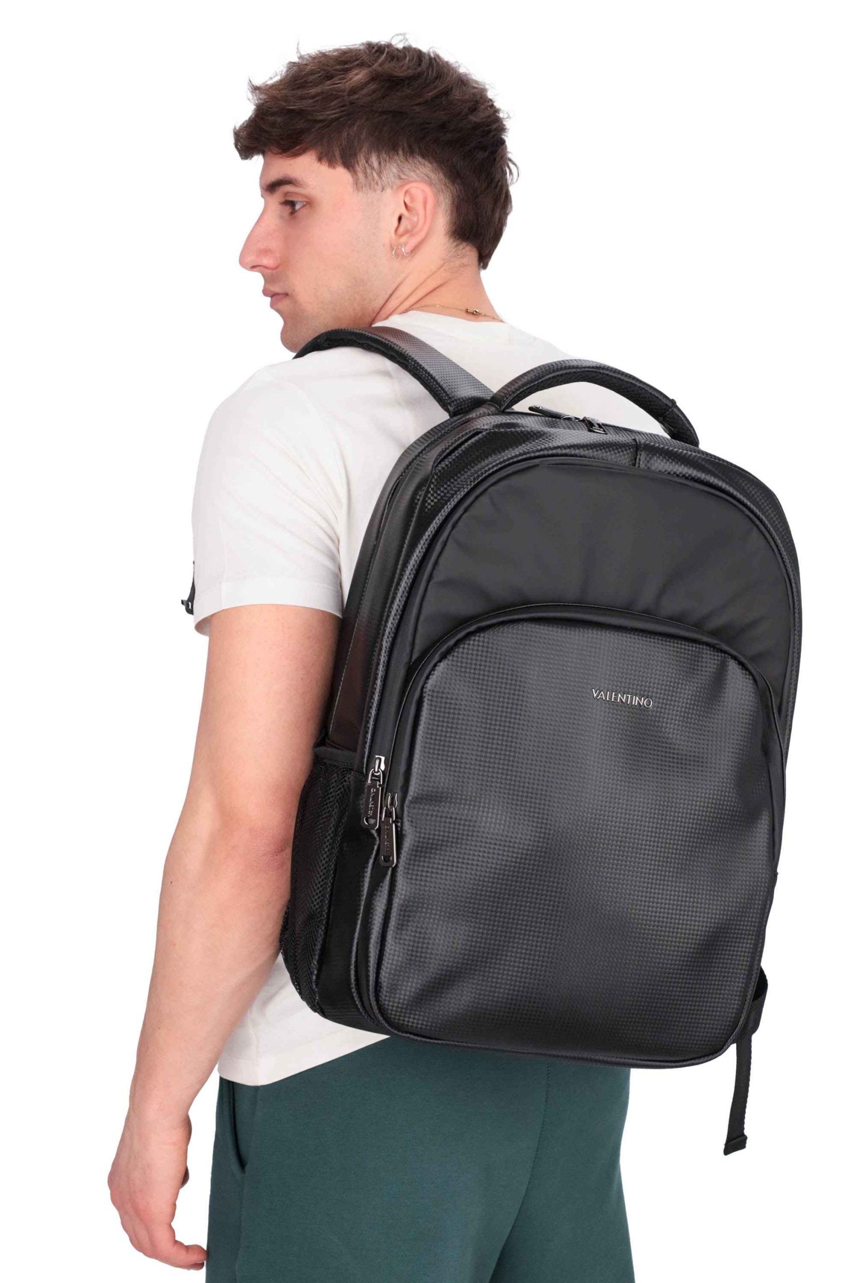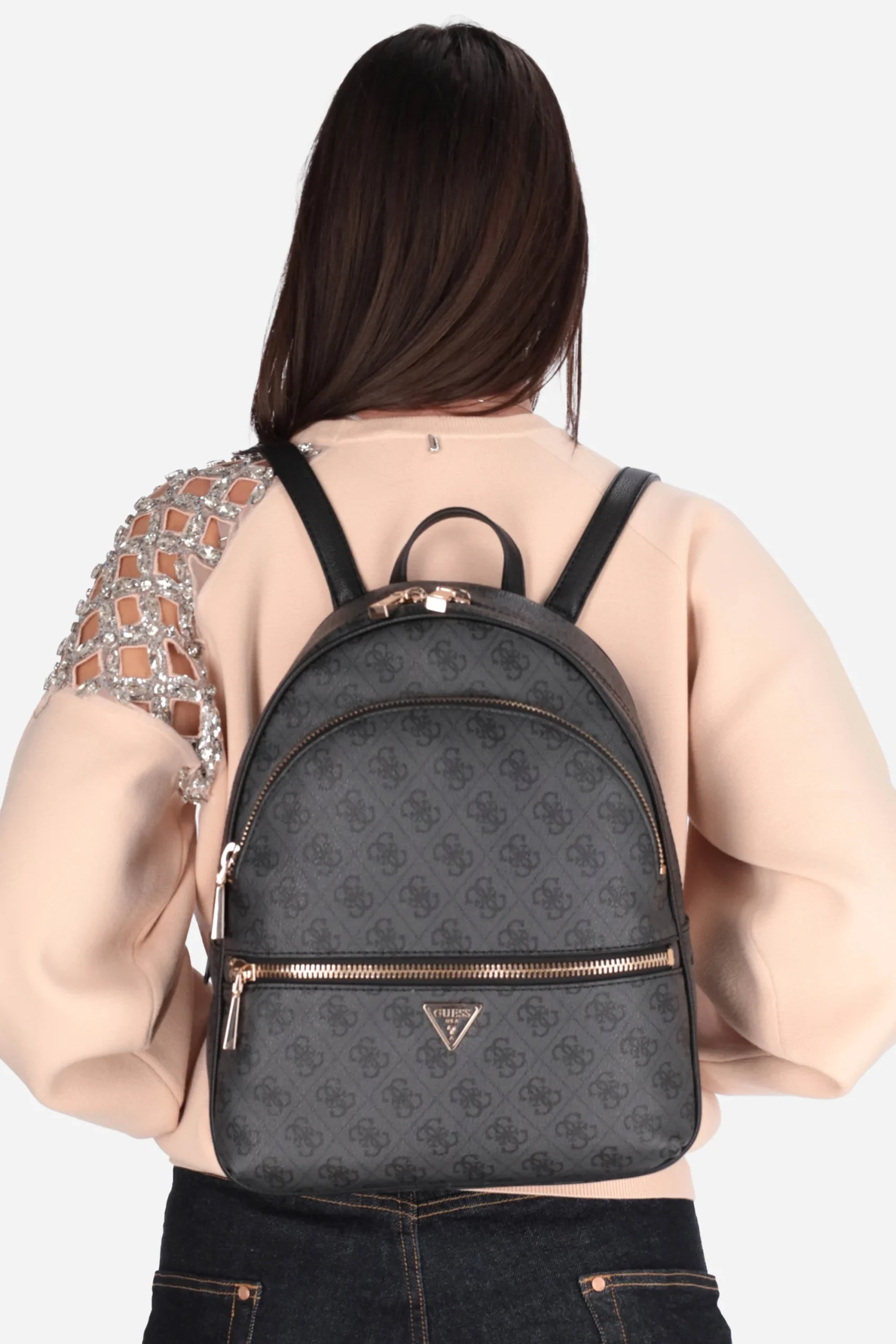 Presenta tasca con zip sul davanti, manico superiore, spallacci regolabili e chiusura con zip.