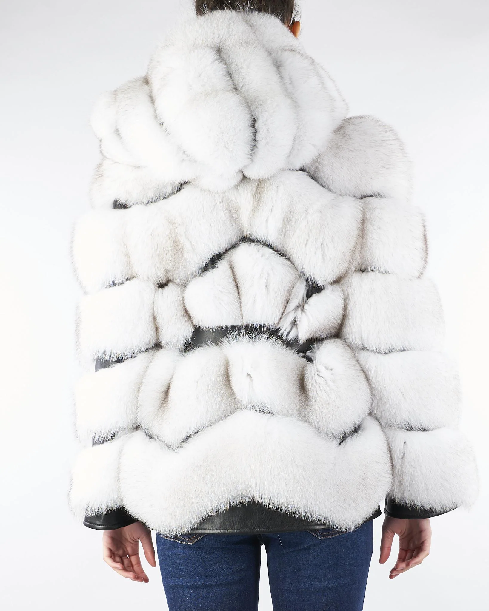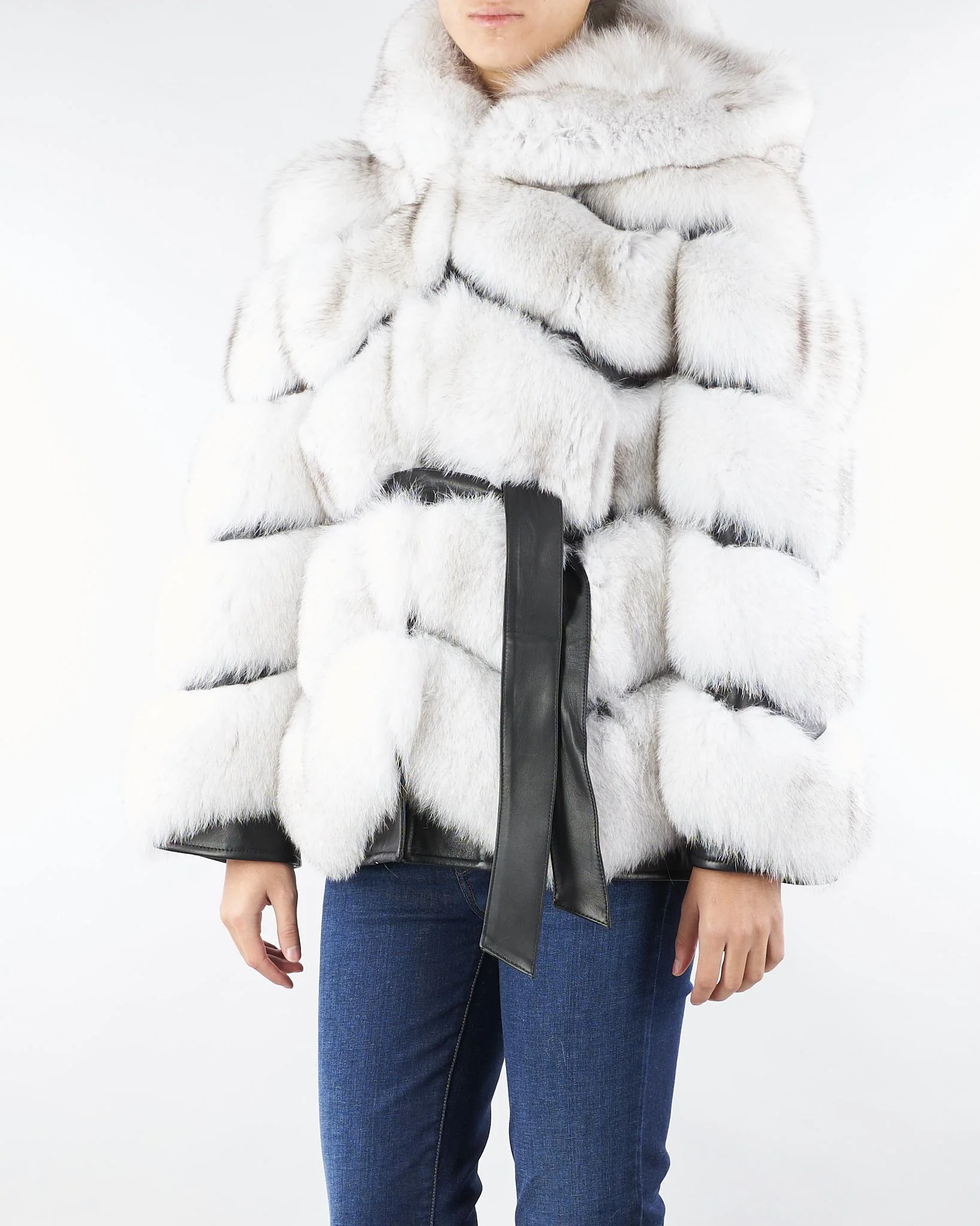 Vera pelliccia di Les Noir. Modello con cappuccio e maniche lunghe. Dettaglio inserti in pelle con cintura coordinata in vita.