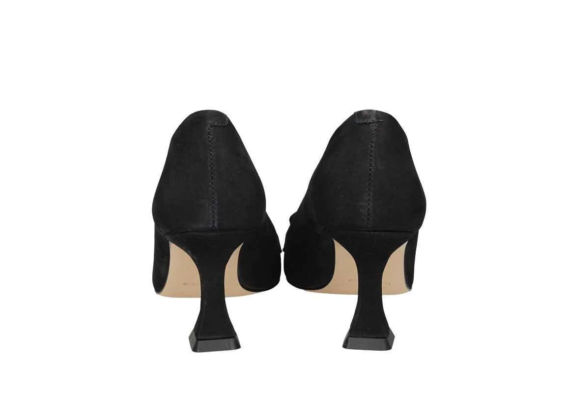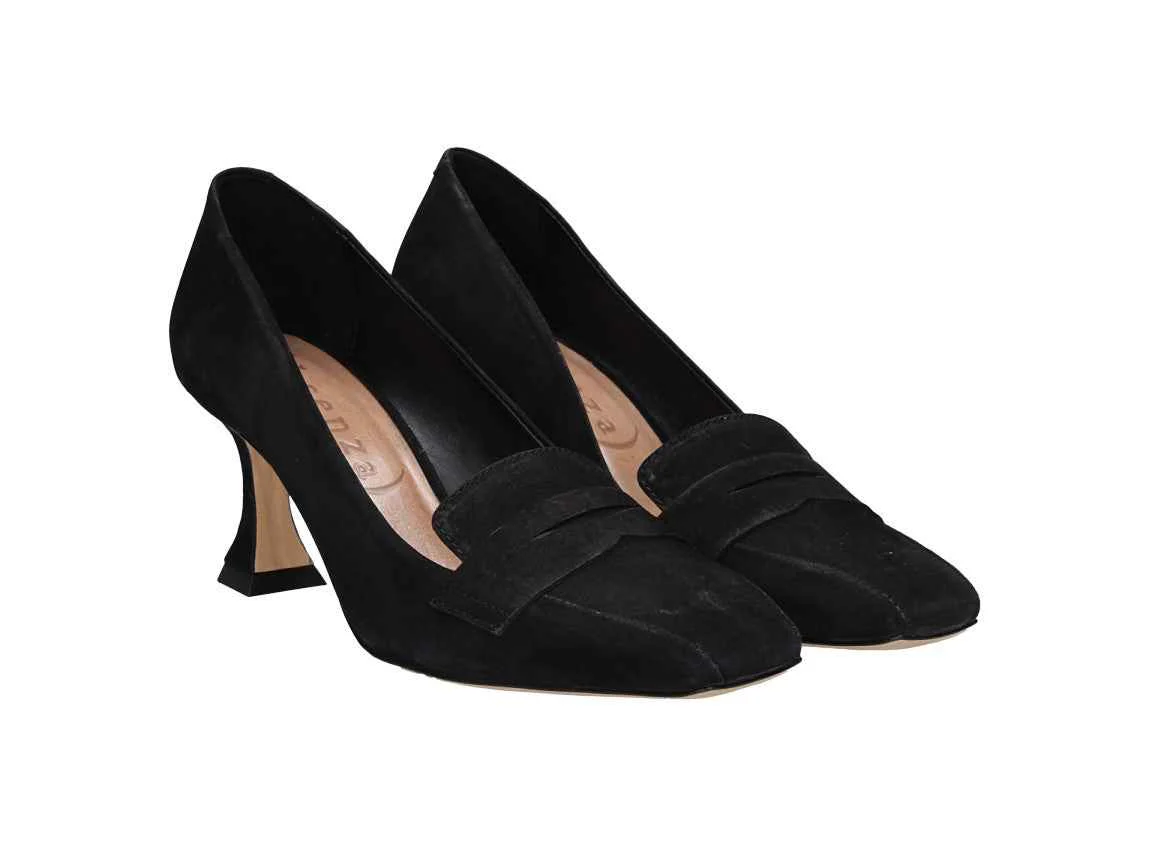 Decollete in nabuk, tacco alto 7cm, suola in gomma, dettaglio sul davanti, interno in pelle.