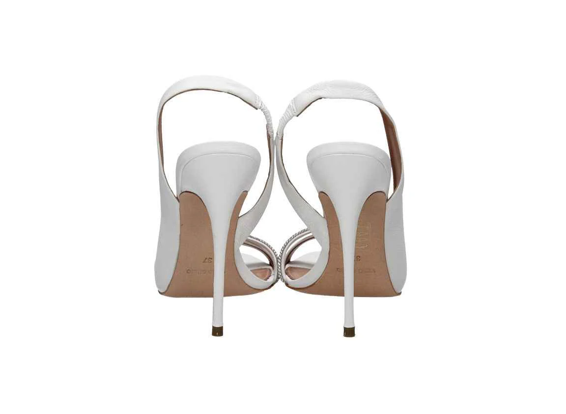 Sandalo in pelle con strass sul davanti, tacco alto 11cm, suola in gomma, con cinturino elasticizzato, soletta in pelle.